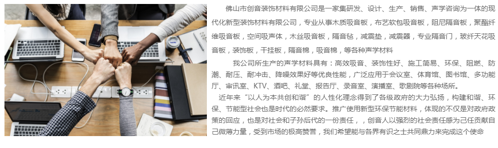 佛山創(chuàng)音——專業(yè)生產(chǎn)吸音板,隔音板,阻燃防潮,聲學降噪吸音裝飾材料工程定制-廠家直供佛山創(chuàng)音、木質(zhì)吸音板、聚酯纖維吸音板、布藝吸音軟包、阻尼隔音板、隔音棉、木絲吸音板、空間吸聲體、砂巖吸音板、碳素吸音板、玻纖天花吸音板、穿孔吸音板、微孔吸音板、會議室吸音板、酒吧隔音、體育館吸聲板、音樂教室吸音板、審訊室防撞軟包。