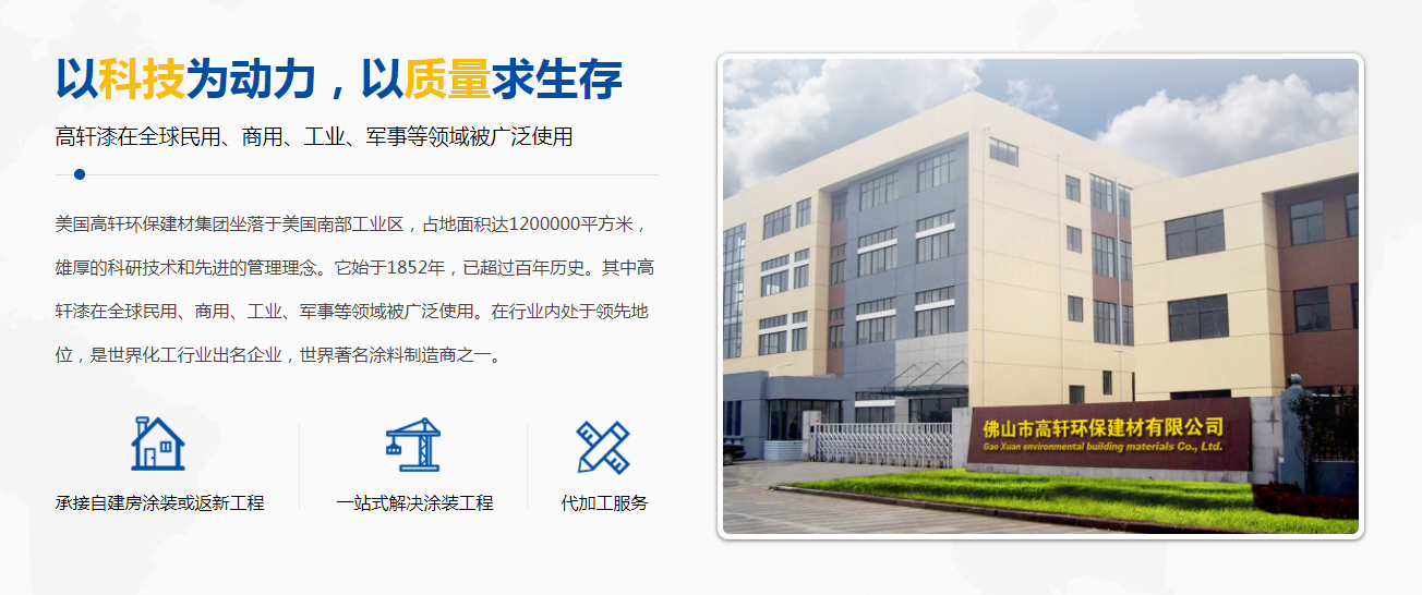 佛山市高軒環(huán)保建材有限公司是一家專注建筑工程涂料(外墻涂料、內(nèi)墻涂料、質(zhì)感外墻涂料、花崗石多彩漆、水包砂仿石漆、真石漆、巖片漆和工業(yè)地坪涂料的生產(chǎn)、銷售、施工為一體的涂料企業(yè)。是國內(nèi)專業(yè)建筑工程涂料生產(chǎn)商之一。高軒建材有限公司位于華南美麗城市有涂料之鄉(xiāng)”美譽(yù)之稱的廣東佛山。憑著優(yōu)越的地理位置先進(jìn)的生產(chǎn)工藝和技術(shù)力量,完善的售后服務(wù),不斷開拓創(chuàng)新,形成一家專業(yè)的建筑工程涂料生產(chǎn)企業(yè)。