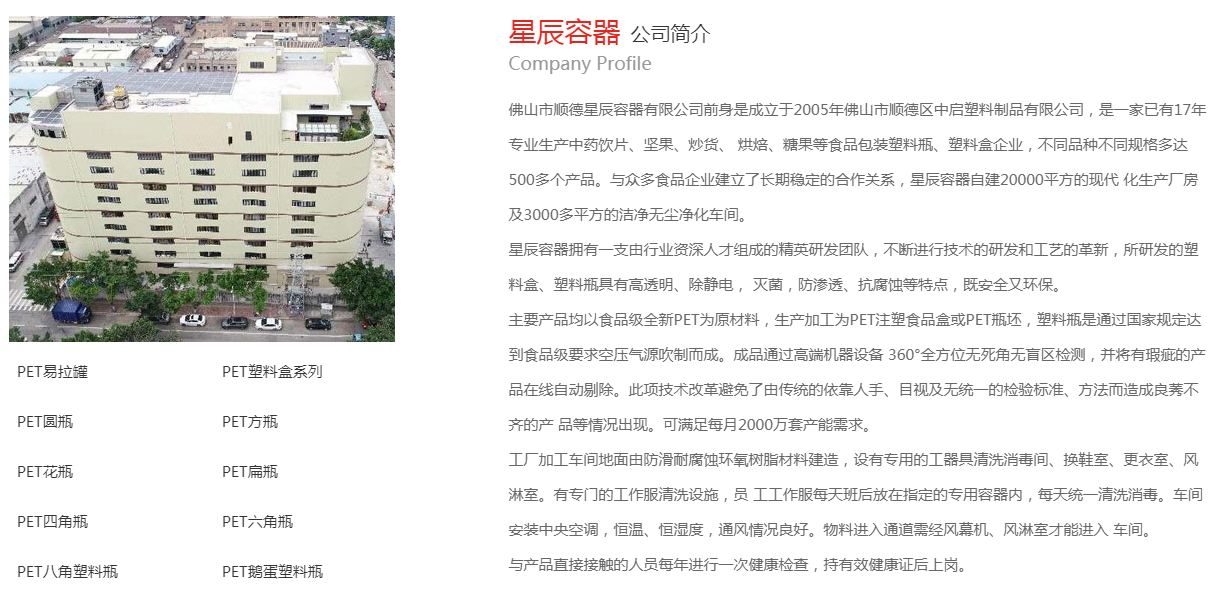 佛山市順德星辰容器有限公司前身是成立于2005年佛山市順德區(qū)中啟塑料制品有限公司,是一家已有16年專業(yè)生產(chǎn)飲片、堅果、炒貨、 烘焙、糖果等食品包裝塑料瓶、塑料盒企業(yè),不同品種不同規(guī)格多達(dá)500多個產(chǎn)品。與眾多食品企業(yè)建立了長期穩(wěn)定的合作關(guān)系,星辰容器自建20000平方的現(xiàn)代 化生產(chǎn)廠房及3000多平方的潔凈無塵凈化車間