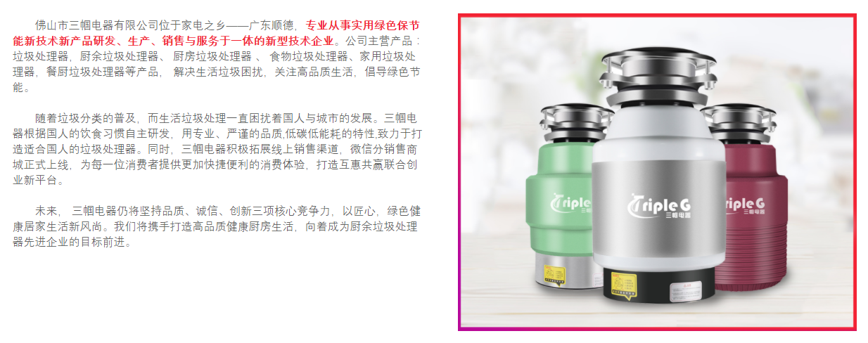 今天分享一個(gè)廚余垃圾處理器網(wǎng)站設(shè)計(jì)案例——佛山市三幗電器有限公司