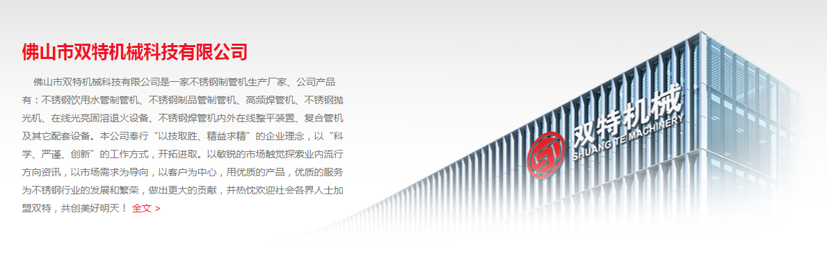 佛山市雙特機(jī)械科技有限公司是一家不銹鋼制管機(jī)生產(chǎn)廠家、公司產(chǎn)品有:不銹鋼飲用水管制管機(jī)、不銹鋼制品管制管機(jī)、高頻焊管機(jī)、不銹鋼拋光機(jī)、在線光亮固溶退火設(shè)備、不銹鋼焊管機(jī)內(nèi)外在線整平裝置、復(fù)合管機(jī)及其它配套設(shè)備。本公司奉行以技取勝、精益求精的企業(yè)理念,以科學(xué)、嚴(yán)謹(jǐn)、創(chuàng)新的工作方式,開拓進(jìn)取。以敏銳的市場(chǎng)觸覺探索業(yè)內(nèi)流行方向資訊,以市場(chǎng)需求為導(dǎo)向,以客戶為中心,好的服務(wù)為不銹鋼行業(yè)的發(fā)展和繁榮,做出更大的貢獻(xiàn),并熱忱歡迎社會(huì)各界人士加盟雙特,共創(chuàng)美好明天!