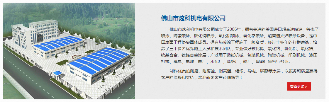 佛山市炫科機(jī)電有限公司成立于2006年,擁有先進(jìn)的進(jìn)口超音速噴涂、等離子噴涂、陶瓷噴涂、碳化鎢噴涂、氧化鋁噴涂、氧化鉻噴涂、超音速火焰噴涂設(shè)備,是表面工程協(xié)會(huì)團(tuán)體成員。擁有熱噴涂工程施工資質(zhì),經(jīng)過十多年的打拼磨練,培養(yǎng)了三十多名施工人員和技術(shù)團(tuán)隊(duì),專業(yè)做好碳化鎢、氧化鉻、氧化鋁、氧化鋯、鎳基合金、鎳鉻合金涂層,廣泛用于造紙機(jī)械、包裝機(jī)械、陶瓷機(jī)械、印刷機(jī)械、液壓機(jī)械、模具、電池、電廠、水泥廠、造紙廠、船廠、陶瓷廠等各行各業(yè)。制作優(yōu)良耐腐蝕、絕緣、導(dǎo)電、屏蔽等涂層,以服務(wù)和質(zhì)量贏得客戶的信賴和支持,歡迎新老客戶蒞臨指導(dǎo)!