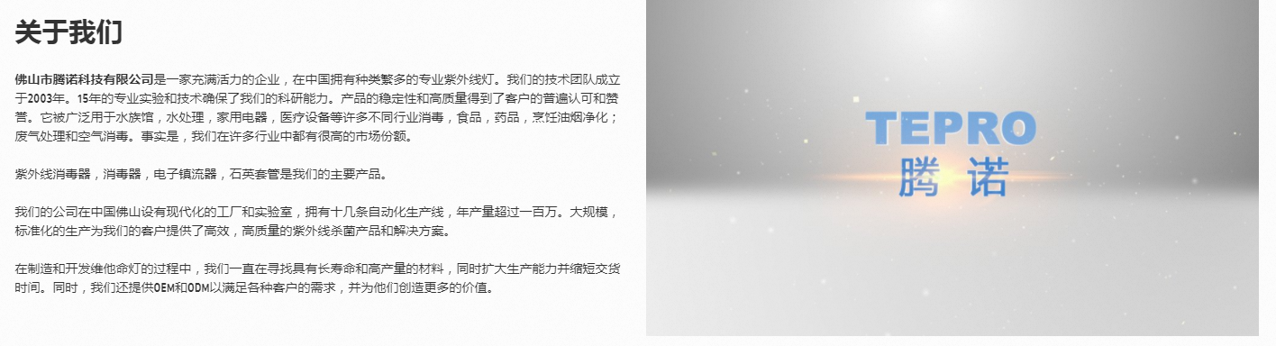 佛山市騰諾科技有限公司是一家充滿活力的企業(yè),在擁有種類繁多的專業(yè)紫外線燈。我們的技術(shù)團(tuán)隊(duì)成立于2003年。15年的專業(yè)實(shí)驗(yàn)和技術(shù)確保了我們的科研能力。產(chǎn)品的穩(wěn)定性和高質(zhì)量得到了客戶的普遍認(rèn)可和贊譽(yù)。它被廣泛用于水族館,水處理,家用電器,設(shè)備等許多不同行業(yè),食品,藥品,烹飪油煙凈化;廢氣處理。事實(shí)是,我們在許多行業(yè)中都有很高的市場份額。