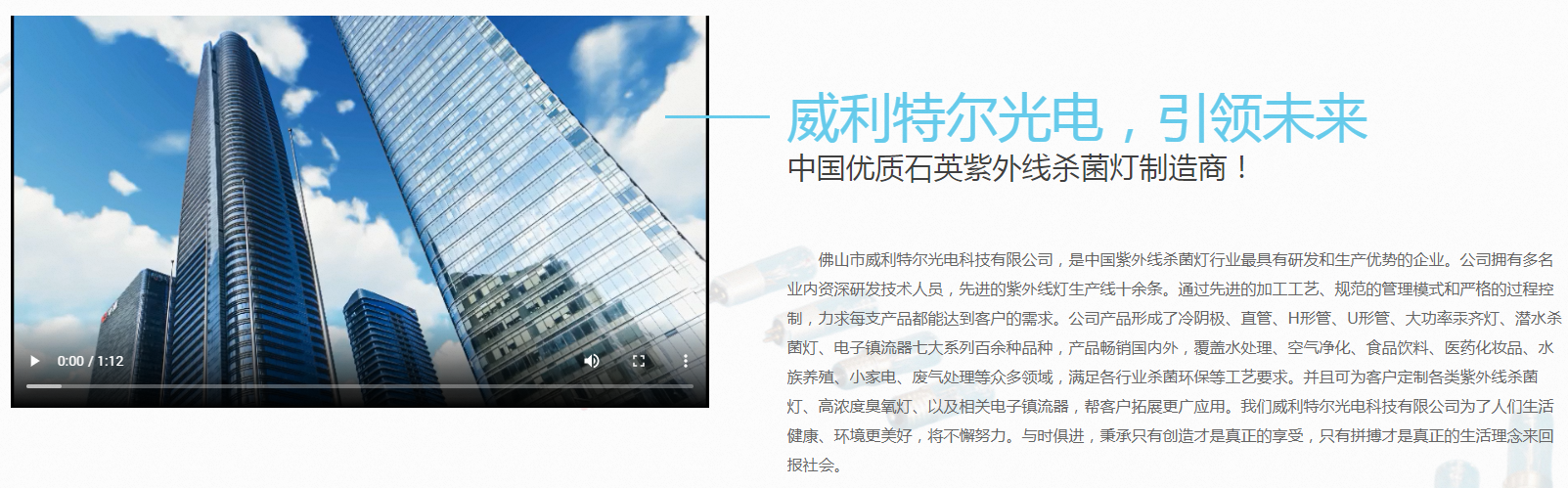 佛山市威利特爾光電科技有限公司,是紫外線燈行業(yè)具有研發(fā)和生產(chǎn)優(yōu)勢(shì)的企業(yè)。公司擁有多名業(yè)內(nèi)研發(fā)技術(shù)人員,先進(jìn)的紫外線燈生產(chǎn)線十余條。通過(guò)先進(jìn)的加工工藝、規(guī)范的管理模式和嚴(yán)格的過(guò)程控制,力求每支產(chǎn)品都能達(dá)到客戶(hù)的需求。公司產(chǎn)品形成了冷陰極、直管、H形管、U形管、大功率汞齊燈、電子鎮(zhèn)流器七大系列百余種品種,產(chǎn)品國(guó)內(nèi)外,覆蓋水處理、空氣凈化、食品飲料、醫(yī)藥化妝品、水族養(yǎng)殖、小家電、廢氣處理等眾多領(lǐng)域,滿(mǎn)足各行業(yè)等工藝要求。并且可為客戶(hù)定制各類(lèi)、高濃度臭氧燈、以及相關(guān)電子鎮(zhèn)流器,幫客戶(hù)拓展更廣應(yīng)用。我們威利特爾光電科技有限公司為了人們生活健康、環(huán)境更美好,將不懈努力。與時(shí)俱進(jìn),秉承只有創(chuàng)造才是真正的享受,只有拼搏才是真正的生活理念來(lái)回報(bào)社會(huì)。