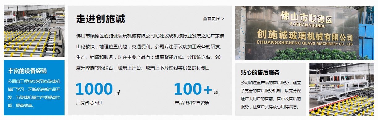 佛山市順德區(qū)創(chuàng)施誠玻璃機械有限公司地處玻璃機械行業(yè)發(fā)展之地廣東佛山倫教鎮(zhèn),地理位置優(yōu)越。公司專注于玻璃加工設(shè)備的研發(fā)、生產(chǎn)、銷售和服務(wù),現(xiàn)在主要產(chǎn)品有:玻璃智能連線、分段輸送臺、90度升降旋轉(zhuǎn)輸送臺、玻璃上片臺、玻璃上下片連線等設(shè)備的訂制。