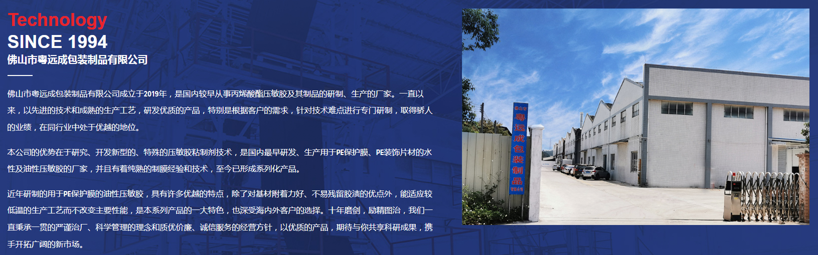 佛山市粵遠(yuǎn)成包裝制品有限公司成立于2019年,是國內(nèi)較早從事丙烯酸酯壓敏膠及其制品的研制、生產(chǎn)的廠家。一直以來,以先進(jìn)的技術(shù)和成熟的生產(chǎn)工藝,研發(fā)好的產(chǎn)品,特別是根據(jù)客戶的需求,針對技術(shù)難點(diǎn)進(jìn)行專門研制,取得驕人的業(yè)績,在同行業(yè)中處于優(yōu)越的地位。