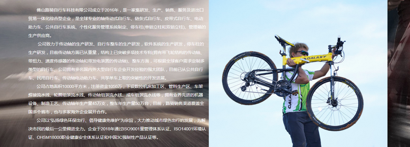 佛山路騎自行車科技有限公司成立于2016年,是一家集研發(fā)、生產(chǎn)、銷售、服務(wù)及進(jìn)出口貿(mào)易一體化綜合型企業(yè),是專業(yè)的軸傳動式自行車、鏈條式自行車、皮帶式自行車、電動助力車、公共自行車系統(tǒng)、個性化服務(wù)管理系統(tǒng)制定、停車柱(單鎖立柱和雙鎖立柱)、管理箱的生產(chǎn)供應(yīng)商。