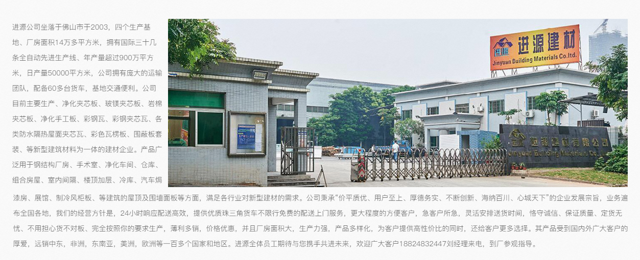 進源公司坐落于佛山市于2003,四個生產基地、廠房面積14萬多平方米,擁有三十幾條全自動先進生產線、年產量超過900萬平方米,日產量50000平方米,公司擁有龐大的運輸團隊,配備60多臺貨車。公司目前主要生產、凈化夾芯板、玻鎂夾芯板、巖棉夾芯板、凈化手工板、彩鋼瓦、彩鋼夾芯瓦、各類隔熱屋面夾芯瓦、彩色瓦楞板、圍蔽板套裝、等新型建筑材料為一體的建材企業(yè)。產品廣泛用于鋼結構廠房、手術室、凈化車間、倉庫、組合房屋、室內間隔、樓頂加層、冷庫、汽車焗