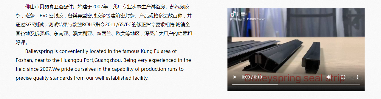 佛山市貝麗春衛(wèi)浴配件廠始建于2007年,我廠專業(yè)從事生產(chǎn)淋浴房、蒸汽房膠條,磁條,PVC密封膠,各類異型密封膠條等建筑密封條。產(chǎn)品規(guī)格多達數(shù)百種,并通過SGS測試,測試結(jié)果與ROHS指令2011/65/EC的修正指令要求相符,銷往各地,深受廣大用戶的信賴和好評。