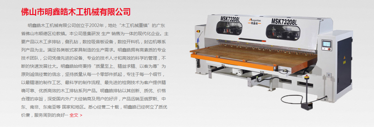 明鑫皓木工機械有限公司創(chuàng)立于2002年,地處“木工機械重鎮(zhèn)”的廣東省佛山市順德區(qū)倫教鎮(zhèn)。本公司是集研發(fā) 生產(chǎn) 銷售為一體的現(xiàn)代化企業(yè)。主要產(chǎn)品以木工多排鉆,側孔鉆,數(shù)控吸音板設備,數(shù)控開料機,封邊機等系列產(chǎn)品為主。滿足各類板式家具制造的生產(chǎn)需求。明鑫皓擁有高素質(zhì)的專業(yè)技術團隊,公司憑借先進的設備、專業(yè)的技術人才科學的管理,不斷的快速發(fā)展壯大。