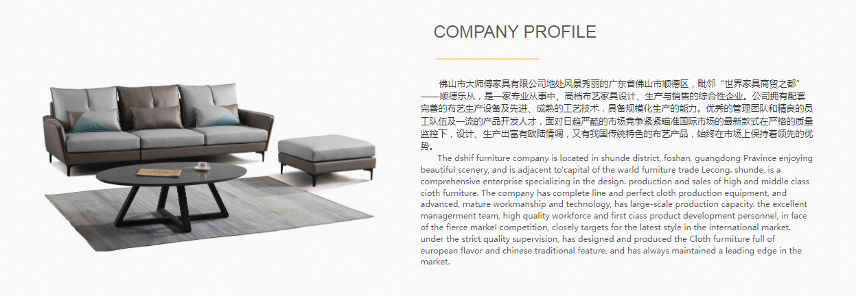 佛山市大師傅家具有限公司地處風(fēng)景秀麗的廣東省佛山市順德區(qū),毗鄰“世界家具商貿(mào)之都”——順德樂從,是一家專業(yè)從事中、布藝家具設(shè)計、生產(chǎn)與銷售的綜合性企業(yè)。公司擁有配套完善的布藝生產(chǎn)設(shè)備及先進、成熟的工藝技術(shù),具備規(guī)?;a(chǎn)的能力。管理團隊和精良的員工隊伍的產(chǎn)品開發(fā)人才,面對日趨嚴酷的市場競爭緊緊瞄準市場的新款式在嚴格的質(zhì)量監(jiān)控下,設(shè)計、生產(chǎn)出富有歐陸情調(diào),又有我國傳統(tǒng)特色的布藝產(chǎn)品,始終在市場上保持著優(yōu)勢。