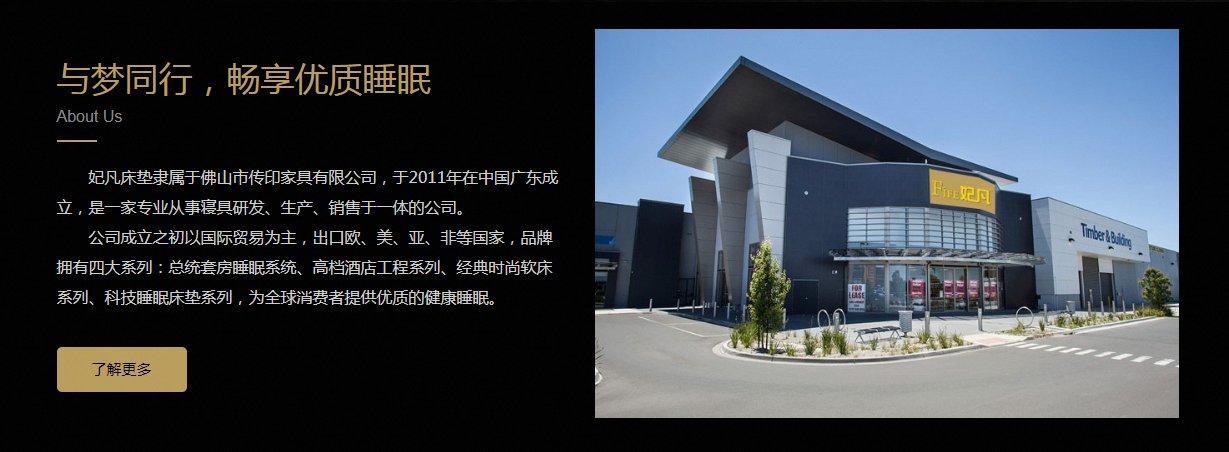 公司成立之初以貿(mào)易為主,出口歐、美、亞、非等國家,品牌擁有四大系列:總統(tǒng)套房睡眠系統(tǒng)、酒店工程系列、經(jīng)典時尚軟床系列、科技睡眠床墊系列,為消費者提供的健康睡眠。