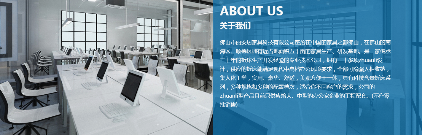 佛山市麗安居家具科技有限公司座落在家具之都佛山,在佛山的南海區(qū)、順德區(qū)擁有近占地面積五十畝的家具生產(chǎn)、研發(fā)基地。是一家傳承二十年的折床生產(chǎn)開(kāi)發(fā)經(jīng)驗(yàn)的專(zhuān)業(yè)技術(shù)公司,擁有三十多項(xiàng)zhuanli設(shè)計(jì),供應(yīng)的折床能滿足現(xiàn)代辦公環(huán)境要求,全部可隱藏入柜收納,集人體工學(xué),實(shí)用、豪華、舒適,美觀方便于一體,具有科技含量折床系列,多種規(guī)格和多種的配置檔次,適合你不同客戶的需求,公司的zhuanli型產(chǎn)品目前只供應(yīng)給大、中型的辦公家企業(yè)的工程配套。(不作零批銷(xiāo)售)