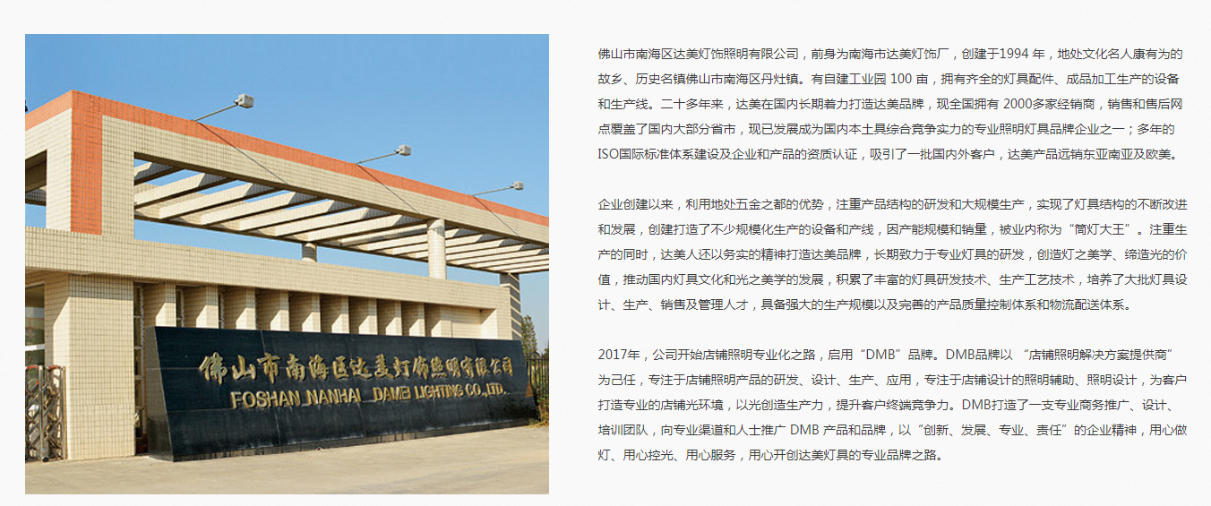 佛山市南海區(qū)達(dá)美燈飾照明有限公司,前身為南海市達(dá)美燈飾廠,創(chuàng)建于1994 年,地處文化名人康有為的故鄉(xiāng)、歷史名鎮(zhèn)佛山市南海區(qū)丹灶鎮(zhèn)。有自建工業(yè)園 100 畝,擁有齊全的燈具配件、成品加工生產(chǎn)的設(shè)備和生產(chǎn)線。二十多年來,達(dá)美在國內(nèi)長期著力打造達(dá)美品牌,現(xiàn)擁有 2000多家經(jīng)銷商,銷售和售后網(wǎng)點(diǎn)覆蓋了國內(nèi)大部分省市,現(xiàn)已發(fā)展成為國內(nèi)本土具綜合競爭實(shí)力的專業(yè)照明燈具品牌企業(yè)之一;多年的 ISO標(biāo)準(zhǔn)體系建設(shè)及企業(yè)和產(chǎn)品的資質(zhì)認(rèn)證,吸引了一批國內(nèi)外客戶。