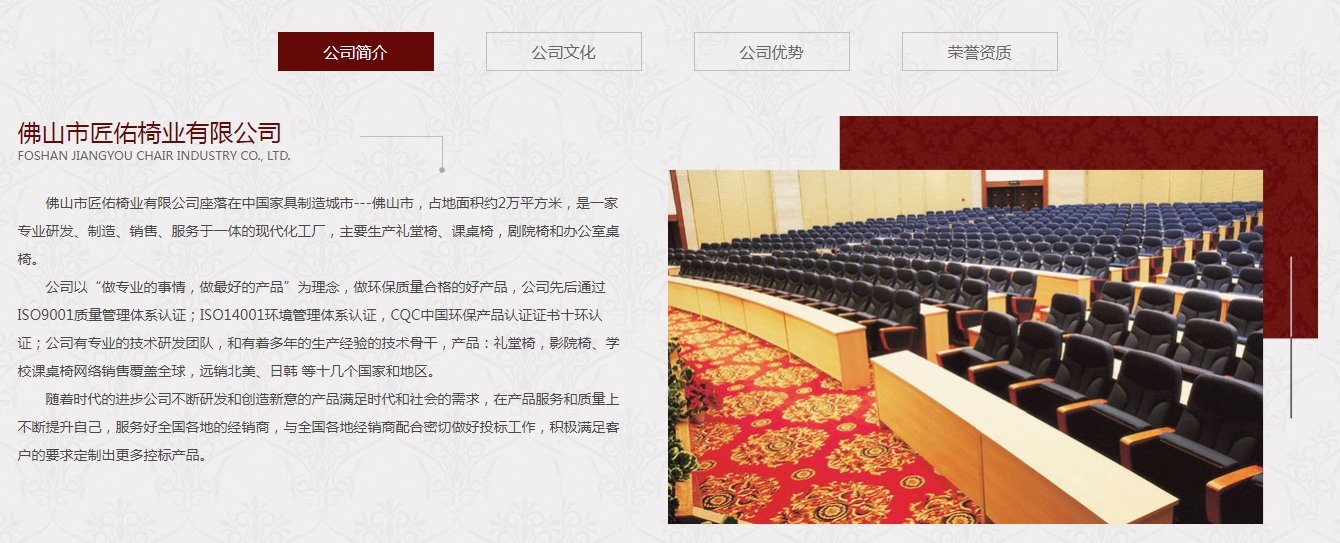今天來分享一個(gè)禮堂椅網(wǎng)站建設(shè)案例——佛山市匠佑椅業(yè)有限公司
