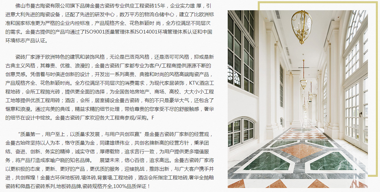瓷磚廠家源于特色的建筑和裝飾風(fēng)格,無論是巴洛克風(fēng)格,還是洛可可風(fēng)格,抑或是新古典主義風(fēng)格,其尊貴、優(yōu)雅、浪漫的,金曼古瓷磚廠家都專業(yè)為客戶/工程商提供源源不斷的創(chuàng)意靈感。憑借著與時俱進(jìn)創(chuàng)新的設(shè)計(jì),開發(fā)出一系列典雅和時尚的風(fēng)格陶瓷產(chǎn)品,產(chǎn)品規(guī)格齊全、花色新穎時尚。多方位滿足不同層次的消費(fèi)需求,為現(xiàn)代家居裝飾,KTV,酒店工程地磚,會所工程拋光磚,提供更全面的選擇,為各地房地產(chǎn)、商場、高校、大大小小工程工地等提供工程用磚;酒店,會所,居室鋪設(shè)金曼古瓷磚,有的不只是大氣,還包含了愜意和浪漫。通過的典線,精益求精的細(xì)節(jié)處理,帶給尊貴的您享受不盡的舒服觸感,細(xì)節(jié)在設(shè)計(jì)中綻放。金曼古瓷磚廠家歡迎各大工程商參觀/采購。