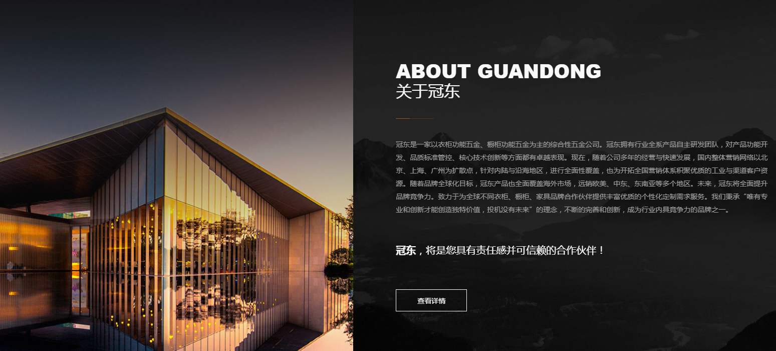 冠東是一家以衣柜功能五金、櫥柜功能五金為主的綜合性五金公司。冠東擁有行業(yè)全系產(chǎn)品自主研發(fā)團(tuán)隊,對產(chǎn)品功能開發(fā)、品質(zhì)標(biāo)準(zhǔn)管控、核心技術(shù)創(chuàng)新等方面都有很好表現(xiàn)?,F(xiàn)在,隨著公司多年的經(jīng)營與快速發(fā)展,國內(nèi)整體營銷網(wǎng)絡(luò)以北京、上海、廣州為擴(kuò)散點(diǎn),針對內(nèi)陸地區(qū),進(jìn)行全面性覆蓋,也為開拓營銷體系積聚的工業(yè)與渠道客戶資源。隨著品牌目標(biāo),冠東產(chǎn)品也全面覆蓋海外市場,遠(yuǎn)銷多個地區(qū)。未來,冠東將全面提升品牌競爭力。致力于為不同衣柜、櫥柜、家具品牌合作伙伴提供豐富的個性化定制需求服務(wù)。我們秉承“唯有專業(yè)和創(chuàng)新才能創(chuàng)造價值,投機(jī)沒有未來”的理念,不斷的完善和創(chuàng)新,成為行業(yè)內(nèi)具競爭力的品牌。