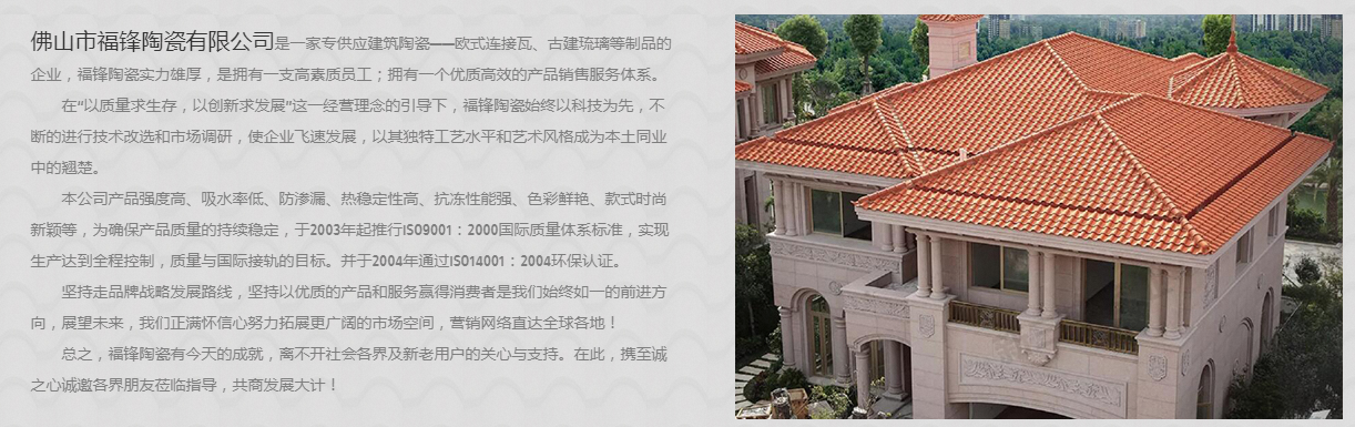 佛山市福鋒陶瓷有限公司是一家供應(yīng)建筑陶瓷——歐式連接瓦、古建琉璃等制品的企業(yè),福鋒陶瓷實力雄厚,是擁有一支高素質(zhì)員工;擁有一個好的產(chǎn)品銷售服務(wù)體系。