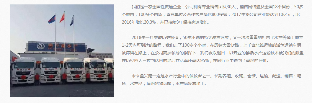 廣東魚(yú)興港水產(chǎn)有限公司,于2015年由原廣州興業(yè)水產(chǎn)轉(zhuǎn)型而成,至今已有二十年水產(chǎn)銷售經(jīng)驗(yàn)。公司于2015年9月19日喬遷至廣東省佛山市南海區(qū)九江鎮(zhèn)沙頭工業(yè)大道南建業(yè)二路,占地面積6000平米米,公司還設(shè)有質(zhì)量檢測(cè)中心、大小分類、低溫暫養(yǎng)、自動(dòng)化包裝生產(chǎn)車間,目前企業(yè)有員工100多人。配備系統(tǒng)化運(yùn)輸供養(yǎng)設(shè)備和大型冷藏車隊(duì),是一家集水產(chǎn)品養(yǎng)殖、收購(gòu)、暫養(yǎng)和低溫冷藏運(yùn)輸為一體的多樣化水產(chǎn)企業(yè)。