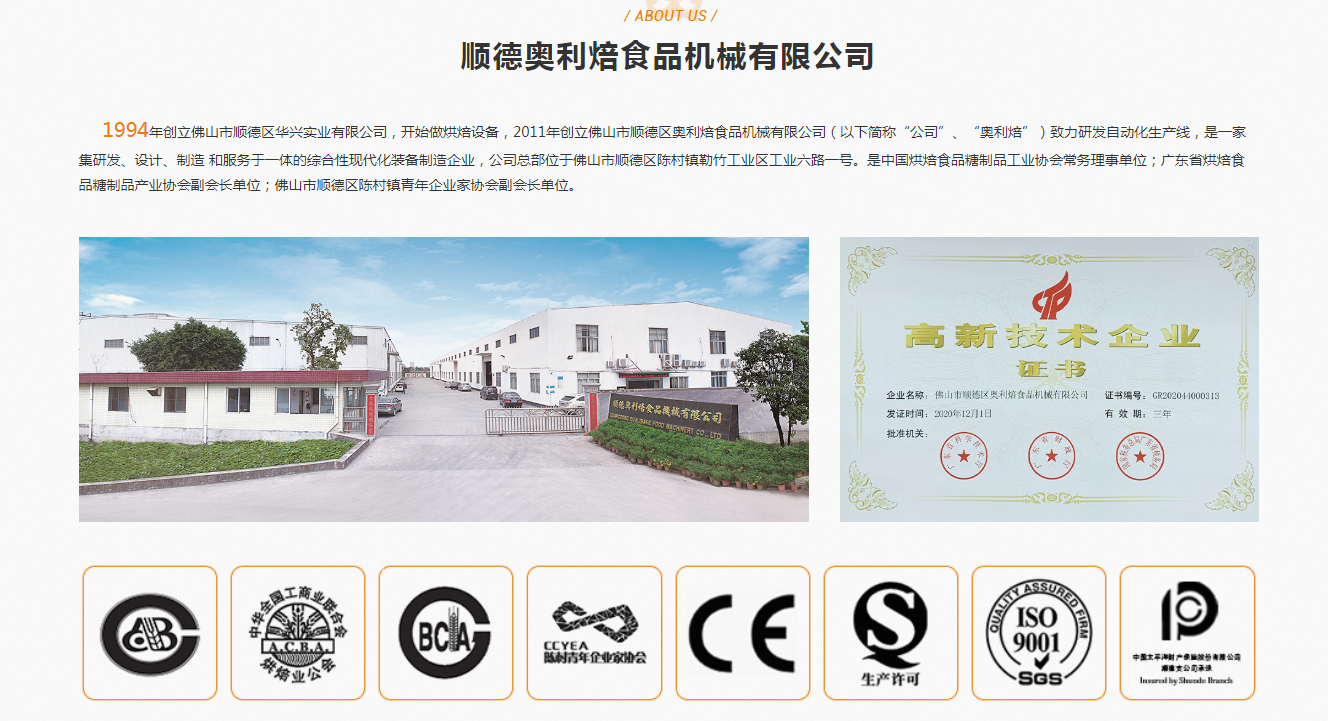 佛山市順德區(qū)華興實(shí)業(yè)有限公司,開(kāi)始做烘焙設(shè)備,2011年創(chuàng)立佛山市順德區(qū)奧利焙食品機(jī)械有限公司(以下簡(jiǎn)稱“公司”、“奧利焙”)致力研發(fā)自動(dòng)化生產(chǎn)線,是一家集研發(fā)、設(shè)計(jì)、制造 和服務(wù)于一體的綜合性現(xiàn)代化裝備制造企業(yè),公司總部位于佛山市順德區(qū)陳村鎮(zhèn)勒竹工業(yè)區(qū)工業(yè)六路一號(hào)。是烘焙食品糖制品工業(yè)協(xié)會(huì)常務(wù)理事單位;廣東省烘焙食品糖制品產(chǎn)業(yè)協(xié)會(huì)副會(huì)長(zhǎng)單位;佛山市順德區(qū)陳村鎮(zhèn)青年企業(yè)家協(xié)會(huì)副會(huì)長(zhǎng)單位。
