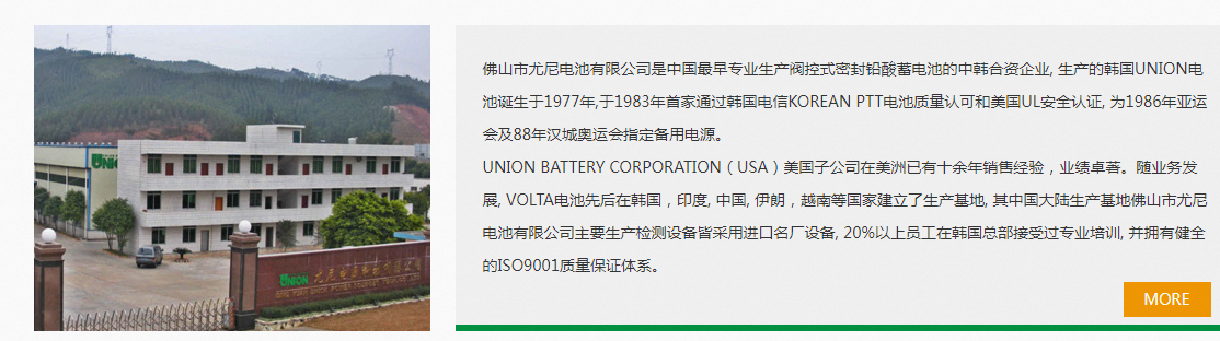 佛山市尤尼電池有限公司是生產(chǎn)閥控式密封鉛酸蓄電池的中韓合資企業(yè), 生產(chǎn)的UNION電池誕生于1977年,于1983年通過電信KOREAN PTT電池質(zhì)量認(rèn)可和UL認(rèn)證, 為1986年亞運(yùn)會(huì)及88年漢城指定備用電源。