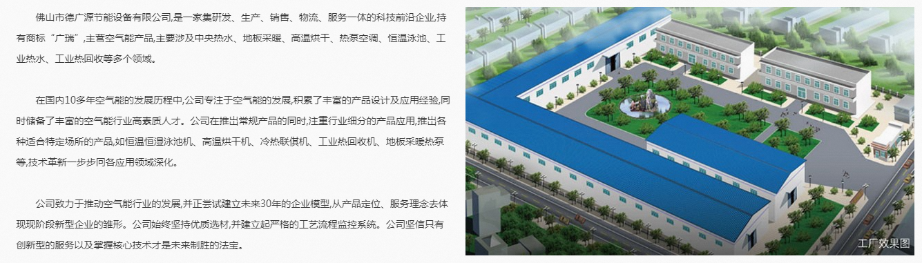 佛山市德廣源節(jié)能設(shè)備有限公司,是一家集硏發(fā)、生產(chǎn)、銷售、物流、服務(wù)一體的科技前沿企業(yè),持有商標(biāo)“廣瑞”,主營(yíng)空氣能產(chǎn)品,主要涉熱水、地板采暖、高溫烘干、熱泵空調(diào)、恒溫泳池、工業(yè)熱水、工業(yè)熱回收等多個(gè)領(lǐng)域。