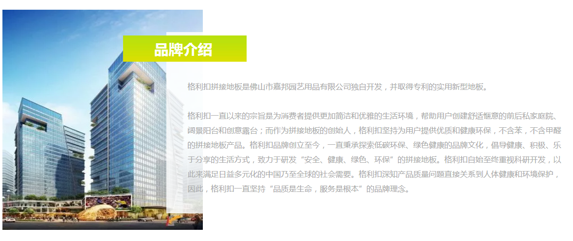 格利扣拼接地板是佛山市嘉邦園藝用品有限公司獨(dú)自開發(fā),并取得專利的實(shí)用新型地板。