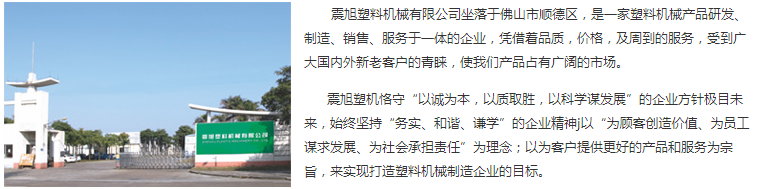 震旭塑料機械有限公司坐落于佛山市順德區(qū),是一家塑料機械產(chǎn)品研發(fā)、制造、銷售、服務(wù)于一體的企業(yè),憑借著品質(zhì),價格,及周到的服務(wù),受到廣大國內(nèi)外新老客戶的青睞,使我們產(chǎn)品占有廣闊的市場。